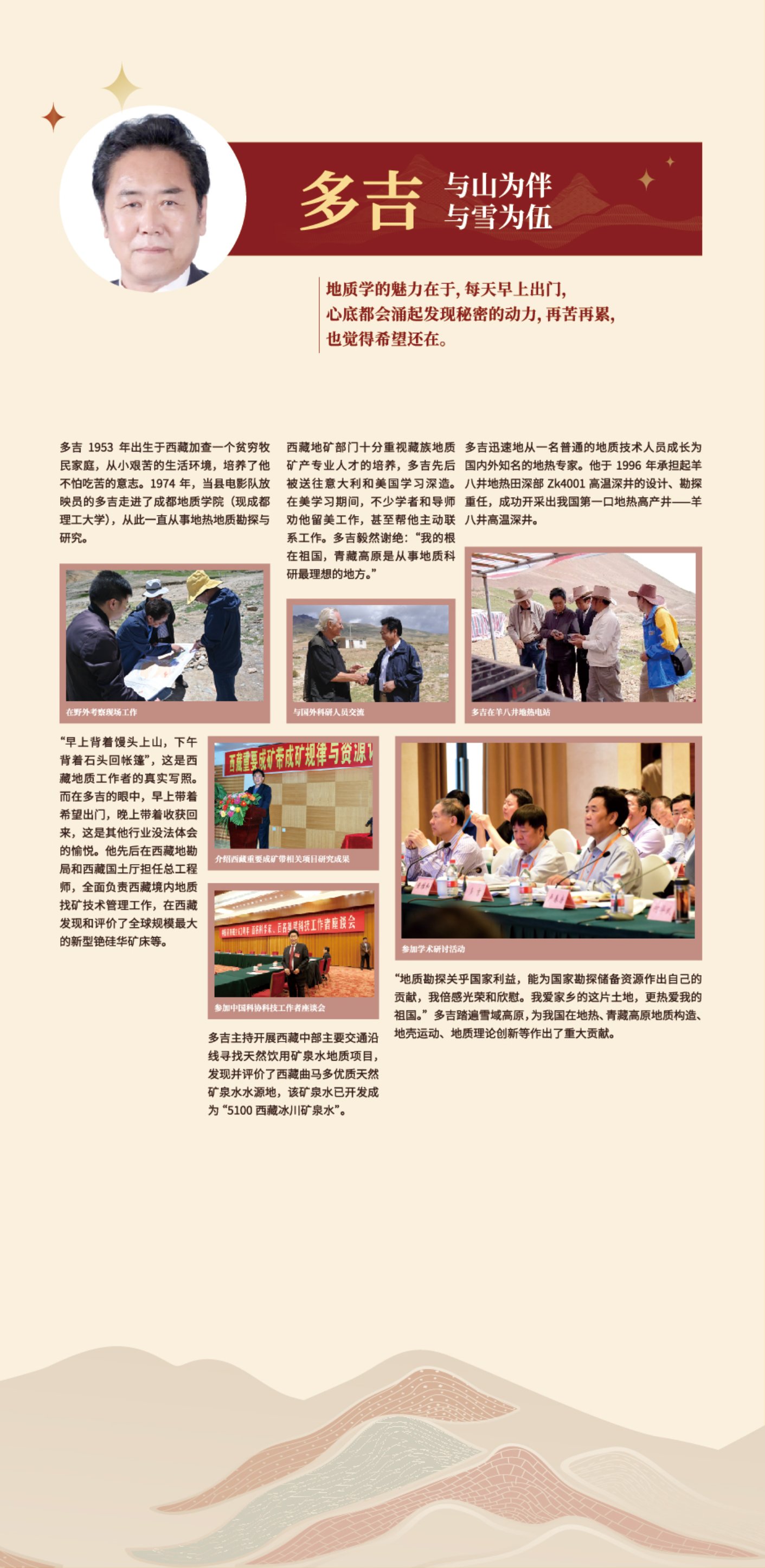 长期从事地热、矿产、水文、工程、环境地质勘查及科研工作,为青藏高原地质理论创新和地质找矿突破作出了积极贡献。