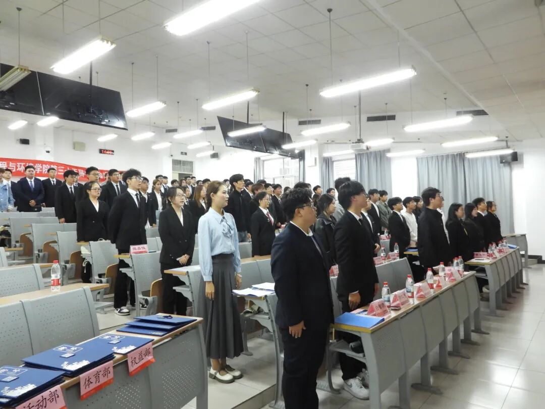 大会在庄严的国歌声中拉开帷幕。全体成员肃立齐唱,激昂的旋律回荡会场,凝聚起新一届学生会成员的责任感与使命感,标志着一段全新旅程的正式开始。