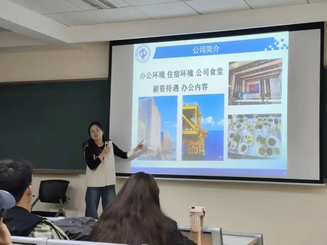 曹欣首先介绍了自己在中海油研究总院的工作内容、团队氛围及职业环境,让在场学子对国企职场有了直观认知。随后,她聚焦职场领导力的底层能力构建,毫无保留地拆解了求职备战与职场适应的实用技巧,涵盖简历制作、企业调研、专业就业方向分析、面试应答策略及就业信息获取渠道等关键内容。