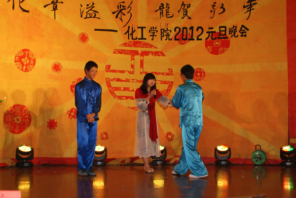 伴着一曲乐器合奏的古典乐曲《茉莉花》,晚会正式开始。晚会以“化章溢彩,龙贺新年”为主题,节目精彩纷呈,青春活泼的校园舞蹈、幽默搞笑的话剧表演、铿锵有力的京剧唱腔、激情四射的民族歌舞,将我们美好的大学生活展现的淋漓尽致;扣人心弦的音乐剧、美轮美奂的机械舞、充满乐趣的互动抽奖令在座的观众掌声不断,大屏幕上不断更新的微博新年祝福,也使现场不时传来阵阵欢笑。本场学生自编自演的视听盛宴充分展现了青年大学生昂扬向上的精神风貌。