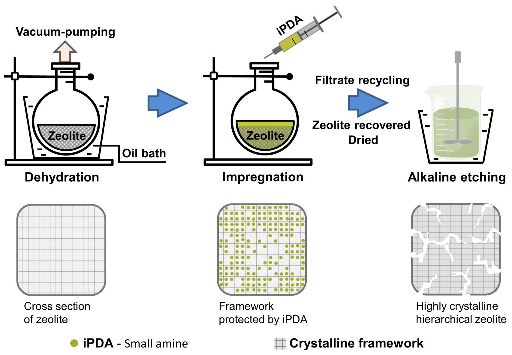 催化剂是炼油及化工技术发展的核心,而沸石分子筛作为其中一类重要的固体酸催化剂,其微孔的传质缺陷严重影响了活性位的利用与催化反应的速率。在沸石分子筛的微孔体系中引入介孔或者大孔对于改善分子传质能力、减缓催化剂失活有着积极的作用。所获得的多级孔沸石分子筛,结合了微孔沸石和介孔分子筛的优点,既具有微孔的择形功能,又具有介孔赋予的高效的分子扩散能力。其中,利用碱性试剂溶解沸石骨架中的硅原子,从而在沸石晶体内产生介孔的方法,被视为最具工业化应用潜力的介孔引入方式,它的优势在于成本低而且简便易行。然而,碱处理脱硅通常存在以下问题:1) 无序刻蚀导致沸石分子筛骨架完整度或结晶度大幅降低,甚至引发骨架坍塌;2) 介孔产生的同时,沸石微孔容和比表面积大幅降低;3) 脱硅过程中常伴随着骨架铝的流失,导致催化反应所需的强酸性位减少。在处理高硅铝比和骨架铝不稳定的沸石分子筛时,以上问题尤为凸显。