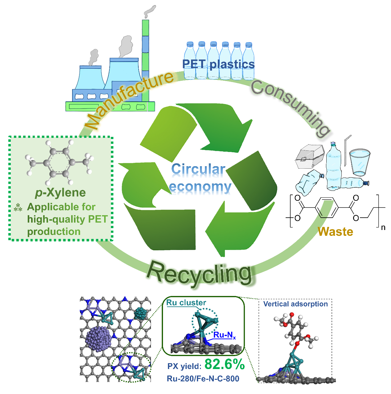 将PET塑料选择性降解为低沸点、易纯化的对二甲苯(PX)等单体分子是一种有前途的促进“循环经济“的战略。作者通过两步法成功合成了RuFe双金属催化剂,其在PET的模型化合物DMT和实际PET塑料的加氢脱氧过程中展现出优异的催化性能,主产物PX的产率分别达到了88.9%和82.6%,与文献报道最先进的催化剂相媲美。联合H2-TPR表征、EXAFS光谱拟合以及模型催化剂的本征活性评价揭示了Fe-Nx位点辅助合成的小Ru团簇和Ru-Nx配位结构是RuFe双金属催化剂中两种核心活性位点。DFT理论计算进一步证实C=O键与活性位点的垂直吸附构型是PX高选择性的根本原因。