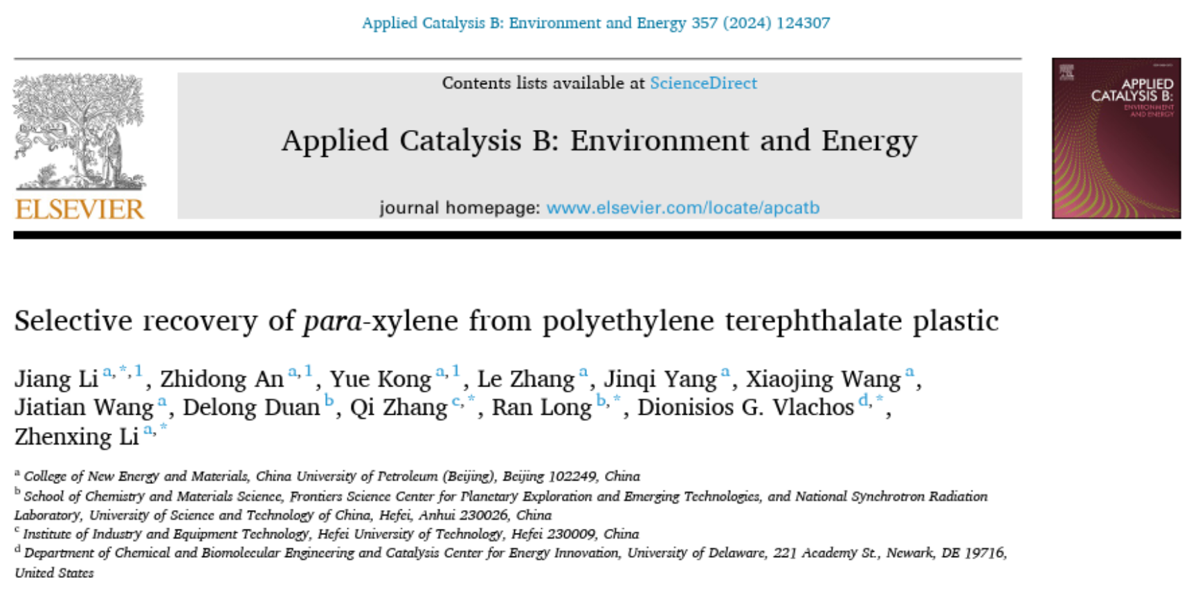 近日,在国家重点研发计划,国家自然科学基金等支持下,开云kaiyun官方网站(北京)新能源与材料学院李江副教授/李振兴教授研究团队联合合肥工业大学张琪副教授,中国科学技术大学龙冉教授以及美国特拉华大学能源创新催化中心Dionisios G. Vlachos教授在塑料降解领域取得重要研究进展。团队发展了一种高选择性RuFe双金属催化剂用于一种PET的模型化合物DMT和实际PET塑料的加氢脱氧过程,成果发表在《Applied Catalysis B: Environment and Energy》上(Appl. Catal. B Environ., 2024, 357, 124307),题目为:“Selective recovery of para-xylene from polyethylene terephthalate plastic”。论文第一作者为新能源与材料学院李江副教授,新能源与材料学院博士研究生安志东和硕士研究生孔悦为共同第一作者,开云kaiyun官方网站(北京)为第一完成单位。