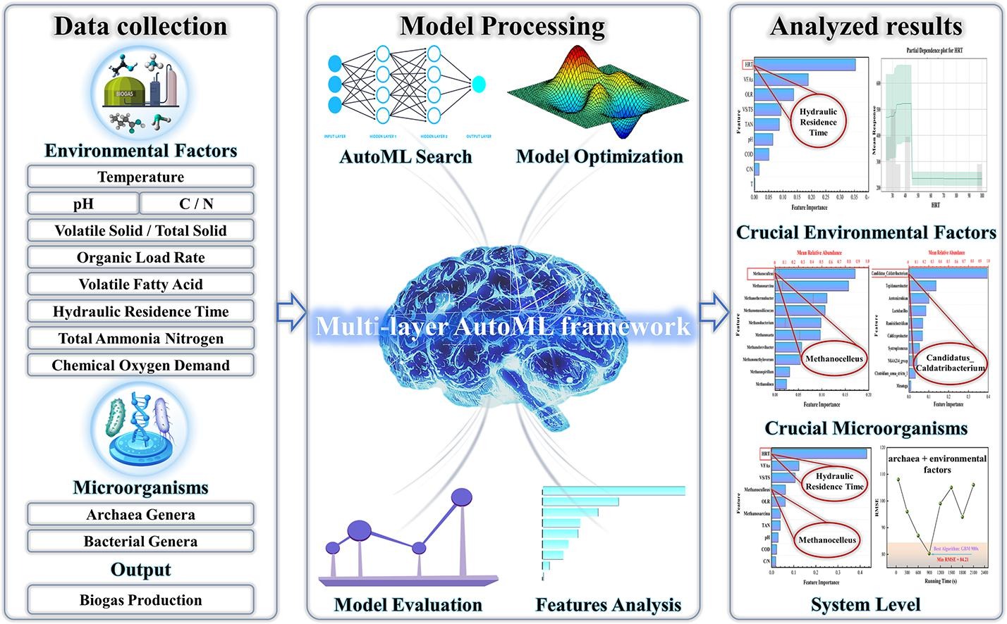 基于先前基础,我们研究了多层面关键因素对复杂厌氧消化系统的影响。提出了一个多层自动机器学习框架,通过在多层次进行性能预测以了解厌氧消化系统中复杂的相互作用,并探索了环境因素、微生物和系统层面的关键因素,有望为理解各规模(工业和实验室)厌氧消化系统的复杂结构提供指导。相关成果以“Using automated machine learning techniques to explore key factors in anaerobic digestion: At the environmental factor, microorganisms and system levels”为题,于2023年9月在国际知名学术期刊Chemical Engineering Journal上发表。论文链接:https://doi.org/10.1016/j.cej.2023.146069.