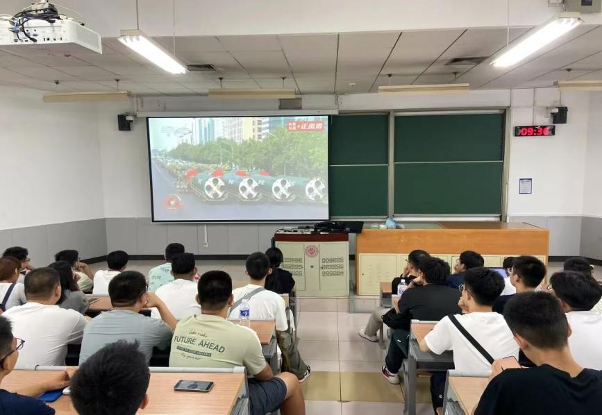 在爱国主义教育实践环节,新生们观看“九三阅兵”直播。气势恢宏的阅兵场面充分展现了国家硬实力,深深感染了在场的每一位同学。观影结束后,新生们自发围绕国家发展与青年责任展开交流,现场气氛热烈,“我心向国、立志报国”的情感在讨论中不断升华,进一步坚定了大家投身专业学习、服务国家战略的理想信念。