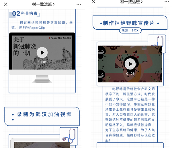 作为材料17-1班班长,宋先晓虽然每天为村民服务,但依旧没耽误班级工作。他利用班级公众号,为同学普及防疫知识;自己制作“拒绝野味”宣传片,科普吃野味的危害,呼吁大家拒绝野味;召开线上主题班会,鼓励班级成员坚定信心、共克时艰……