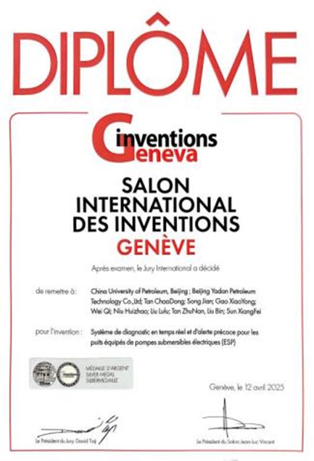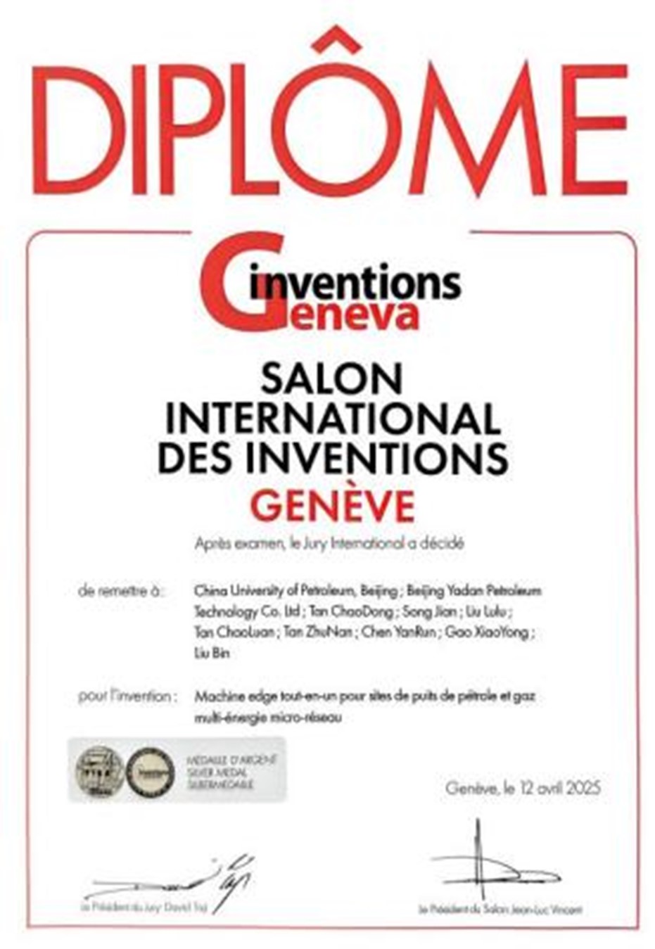 4月9日至4月13日,第50届“日内瓦国际发明展”在瑞士日内瓦举行,展示了近40个国家和地区的1000多项发明成果。开云kaiyun官方网站人工智能学院檀朝东、高小永、刘斌团队研发的"潜油电泵举升井实时诊断预警系统"和"多能微网采油气井场边缘一体机"参加现场展示,凭借其卓越的创新性和显著的应用价值,荣获2项银奖。