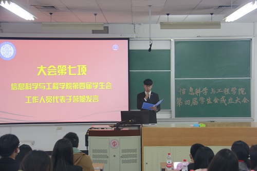 图2 第四届学生会主席于世隆宣读《信息科学与工程学院学生会章程》