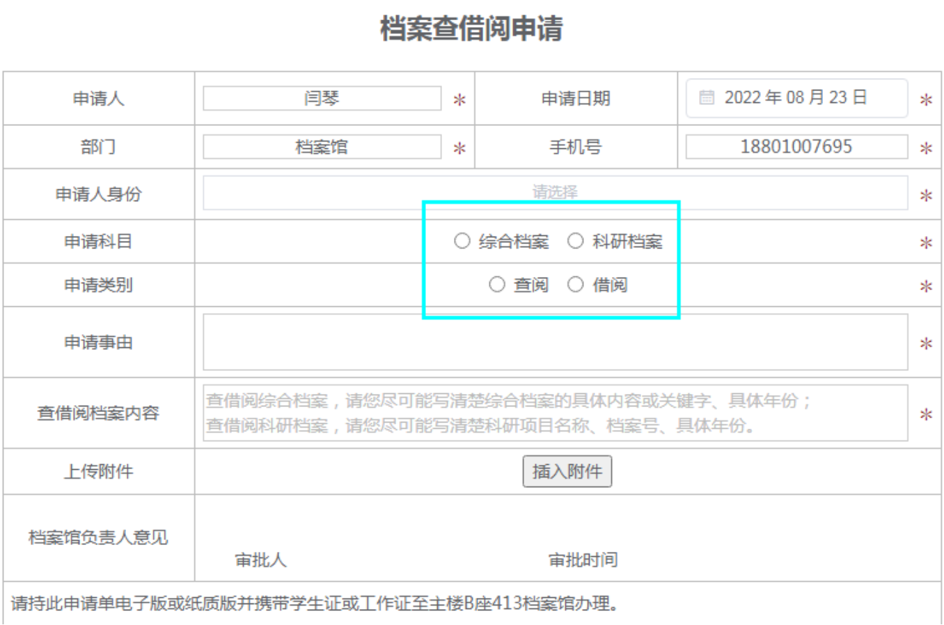5.档案馆负责人审批通过后,系统会自动告知档案馆经办老师,申请人携带本人有效证件前往主楼B座413即可办理档案查借阅,如有档案借出,请在30天内发起归还。