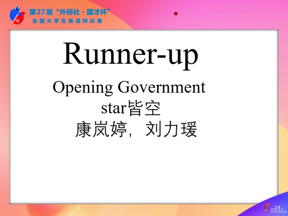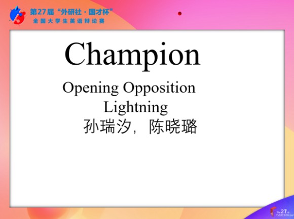 外国语学院2022级本科生孙瑞汐、陈晓璐获校选赛冠军,并获“最佳辩手”称号与华北地区复赛资格。外国语学院2022级本科生康岚婷、刘力瑗获校选赛亚军,外国语学院2022级本科生张子怡、孟润妍,以及2022级本科生赵阳、杨越获校选赛季军。