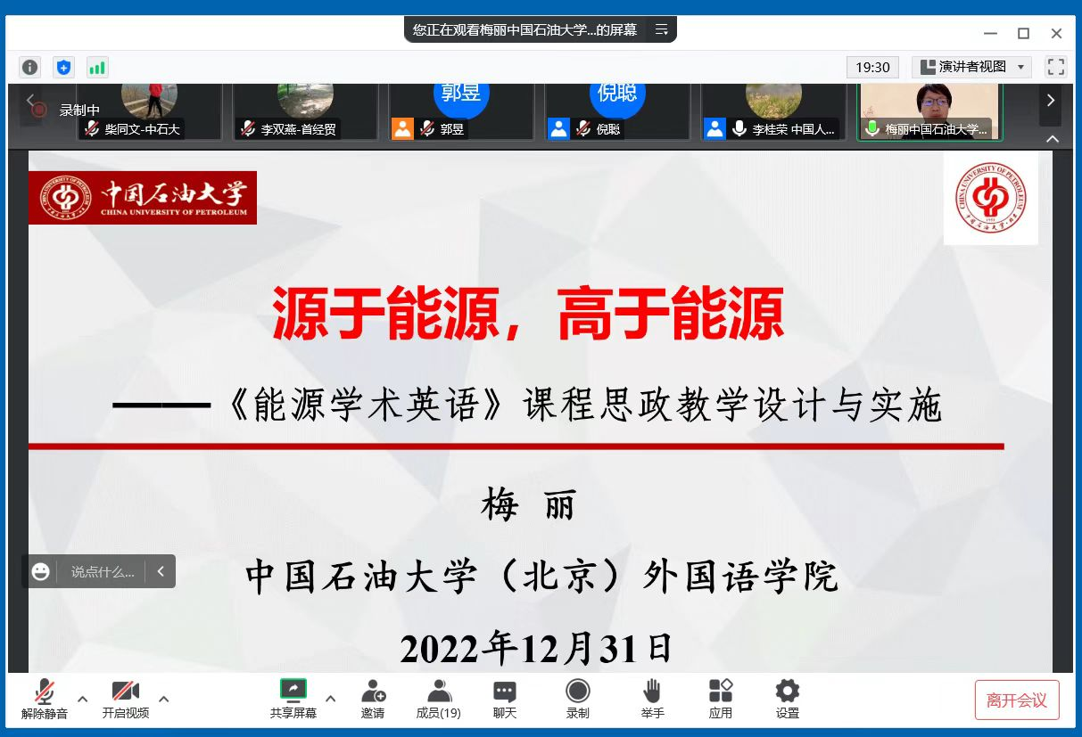 我院郑世高老师和梅丽老师也分别以《能源人文特色与理解当代中国结合的课程思政探索》和《源于能源、高于能源——<能源学术英语>课程思政教学设计与实施》为题,在论坛上介绍了开云kaiyun官方网站(北京)外国语学院的探索与实践。郑世高老师介绍了英语专业在新文科建设的背景下,积极打造能源人文特色,开创能源国际组织与全球治理等特色课程,丰富了外语人才培养的内涵。随着“理解当代中国”系列教材的推广使用,英语专业融合能源人文特色和理解当代中国培养目标,切实将课程思政做实、做细、做优。梅丽老师以“能源与伦理”(energy and ethics)这一单元为例,从课前导入、渐入佳境和延伸拓展三个层次,系统呈现并解析了《能源学术英语》课程的思政目标、实施途径和教学效果,以期为我国能源特色类高校通用学术英语课程思政教学提供借鉴和参考。