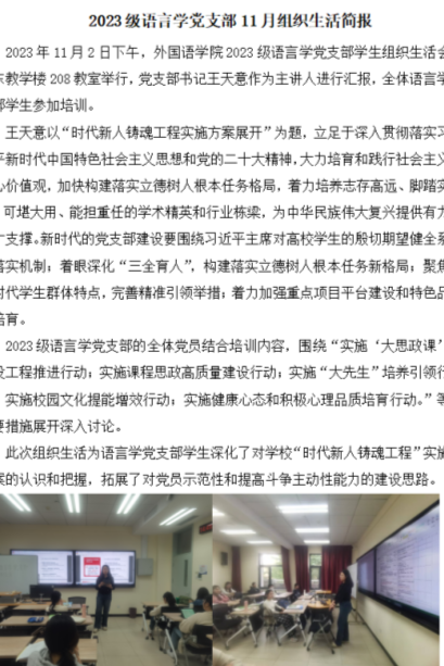 党的基层组织是党在社会基层组织中的战斗堡垒,是党的全部工作和战斗力的基础。外国语学院始终坚持以习近平新时代中国特色社会主义思想为指引,不断激活党建引领“红色引擎”,推动组织生活转化为增强党组织活力的“金钥匙”和淬炼党员干部党性的“大熔炉”,为学院高质量发展蓄力赋能。