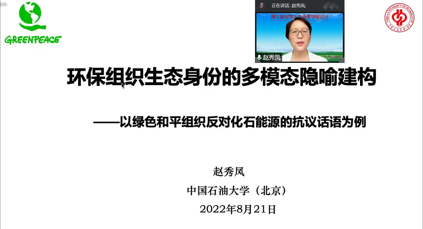 赵秀凤教授作为主旨发言专家,作了题为“环保组织生态身份的多模态隐喻建构——以绿色和平组织反对化石能源的抗议话语为例”的报告,从多模态隐喻的视角探讨了国际环保组织的生态身份建构问题,通过展示丰富的图文语料,生动地阐明了绿色和平组织在多模态抗议话语中建构的多重生态身份。该项研究体现了能源话语研究的生态语言学视角,为推动我院的特色研究——能源话语研究开拓了理论视野。