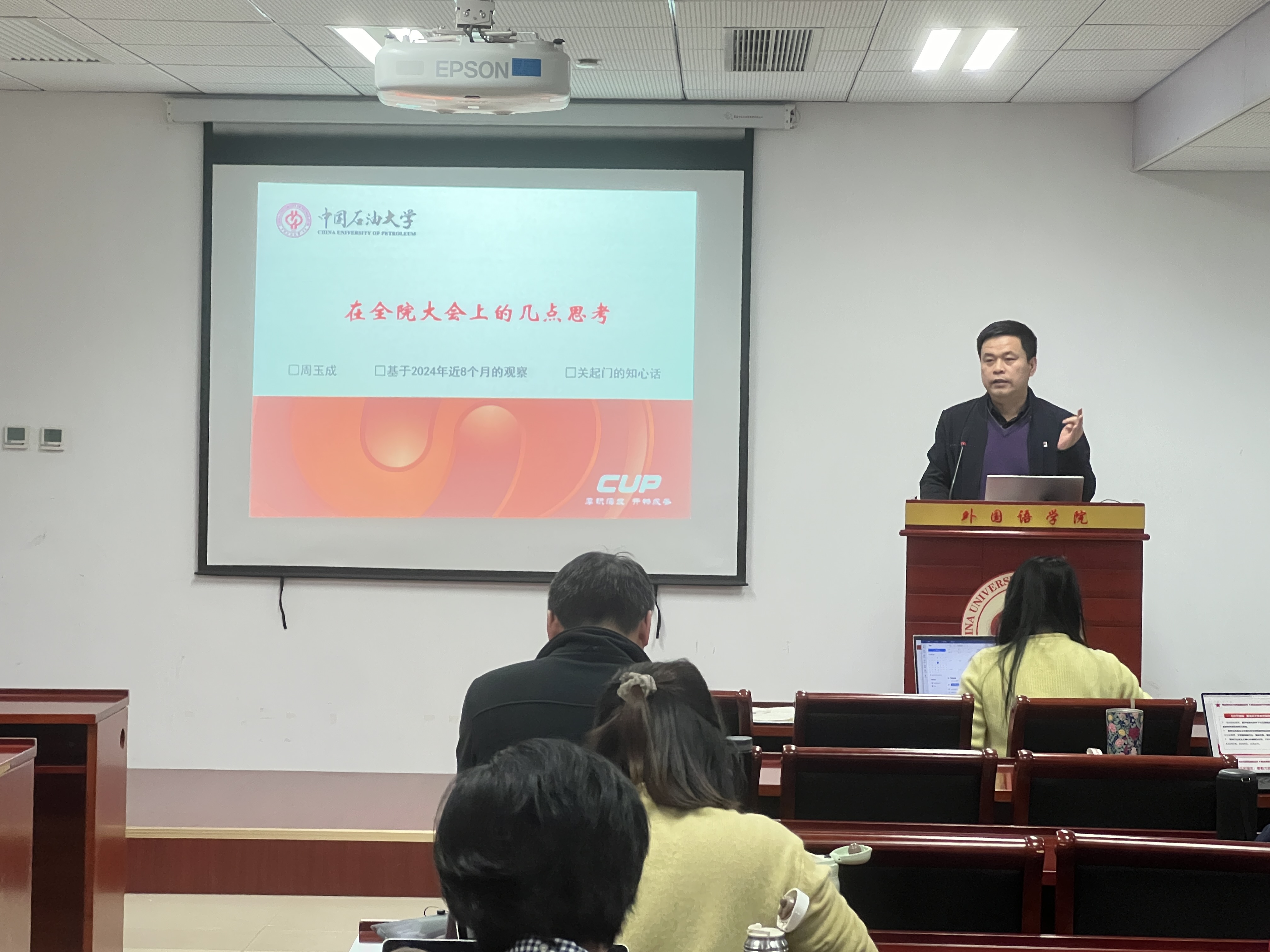 12月5日,外国语学院开展学习贯彻党的二十届三中全会精神专题培训暨12月党支部组织生活和教职工政治理论学习集体学习,全体党员教师参会,党委书记周玉成主持会议。