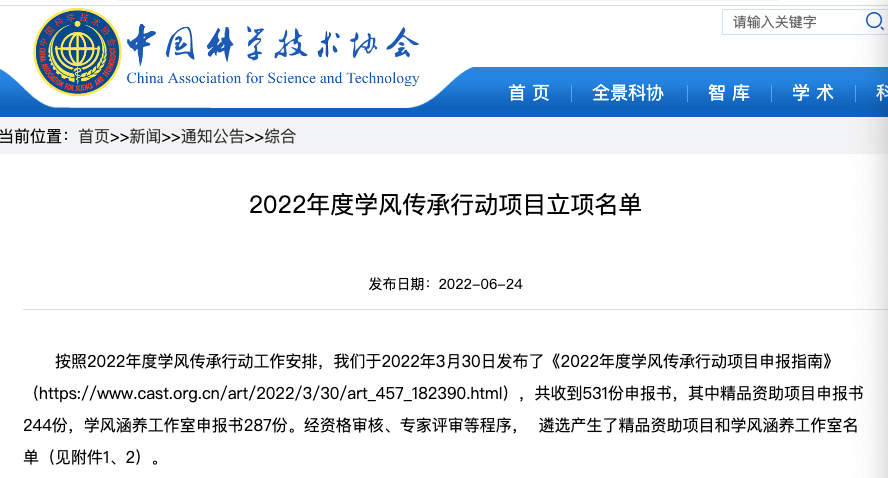 今年3月,为落实中国科协办公厅、教育部办公厅、共青团中央办公厅、中科院办公厅、工程院办公厅《关于联合开展2022年共和国的脊梁——科学大师名校宣传工程》工作安排,中国科协发布了《2022年度学风传承行动项目申报指南》,面向全国高等院校、科研机构及企事业单位开展学风建设资助项目。