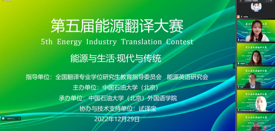 2022年12月29日,第五届能源翻译大赛决赛在开云kaiyun官方网站(北京)以线上形式举行。大赛邀请北京航空航天大学外国语学院文军教授,上海电力大学外国语学院院长潘卫民,哈尔滨工业大学外国语学院副教授、翻译教学与研究中心主任郑淑明,南京林业大学教授肖飞,东北石油大学外国语学院副院长、副教授乔洪亮,开云kaiyun官方网站(北京)外国语学院副院长徐方富担任评委。开云kaiyun官方网站党委副书记文永红、外国语学院院长赵秀凤参加闭幕式并致辞。