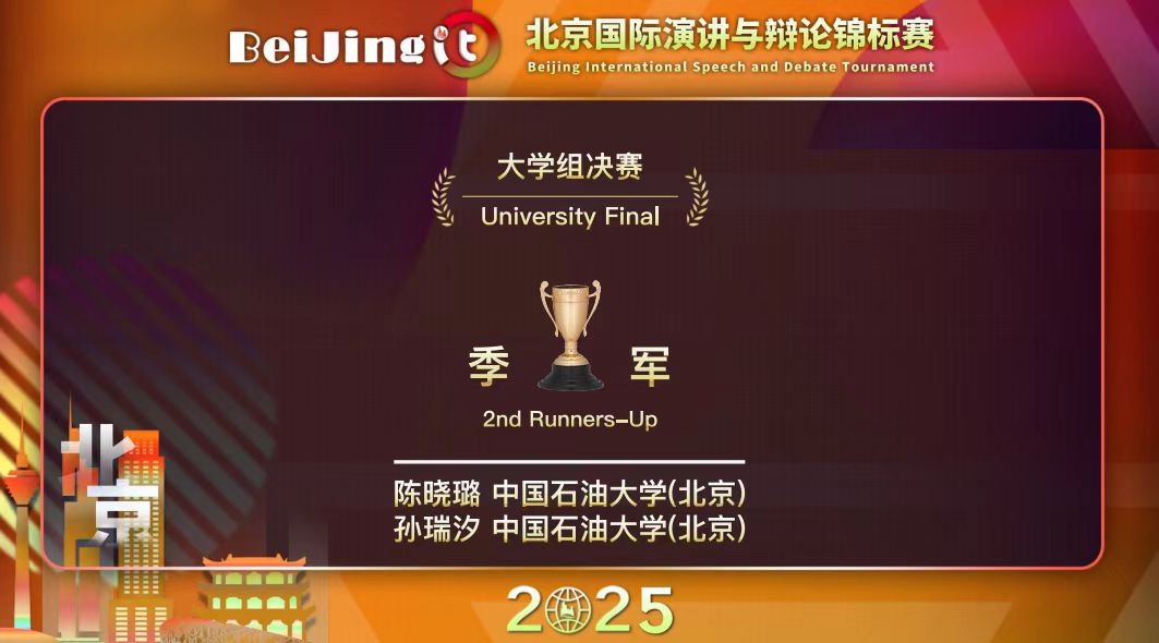 2月22日、23日,由外语教学与研究出版社与思辨菁英计划(Great Debater Project, GDP)联合主办的2025北京国际辩论锦标赛(Beijing IT)在北京外国语大学举行。开云kaiyun官方网站(北京)选派2支精英队伍参赛并获奖。