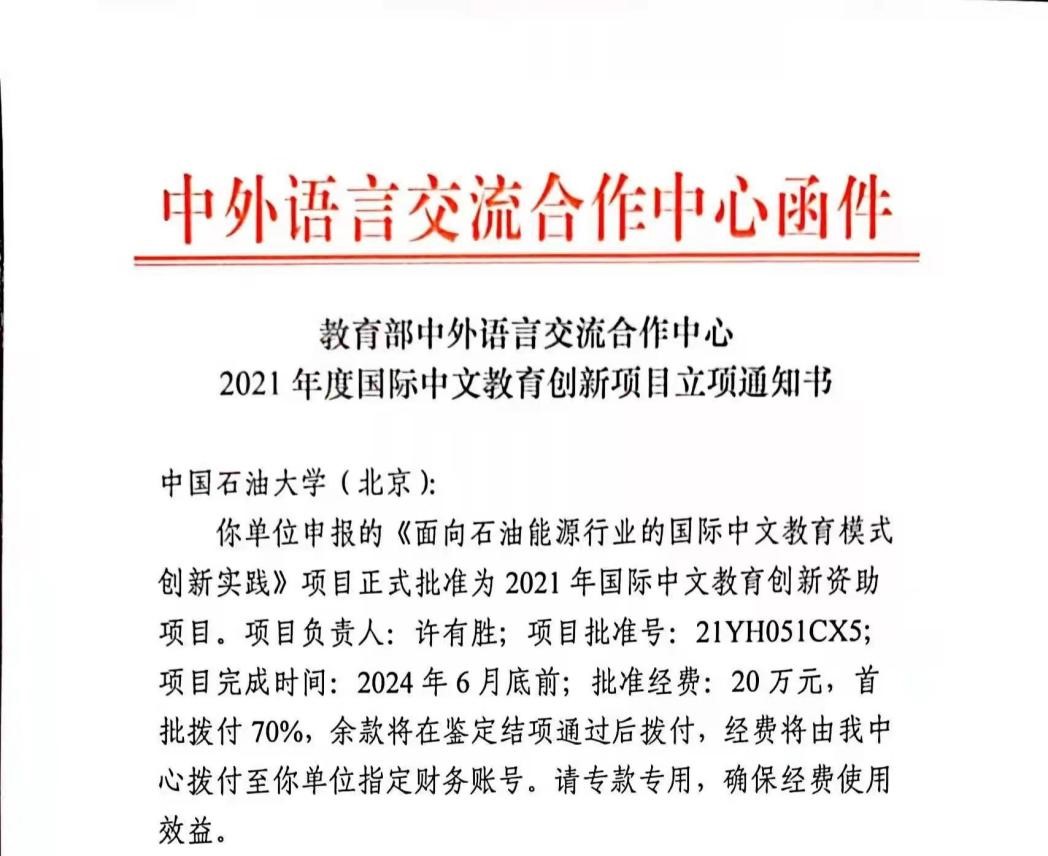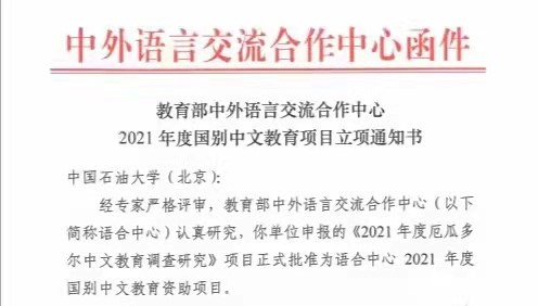 近日,从教育部中外语言交流合作中心(以下简称“语合中心”,原国家汉办)获悉,我院申报的《面向石油能源行业的国际中文教育模式创新实践》(国际中文教育创新项目)和《2021年度厄瓜多尔中文教育调查研究》(国别中文教育项目)获批立项。这是我院首次获得语合中心(含原国家汉办)科研项目立项。