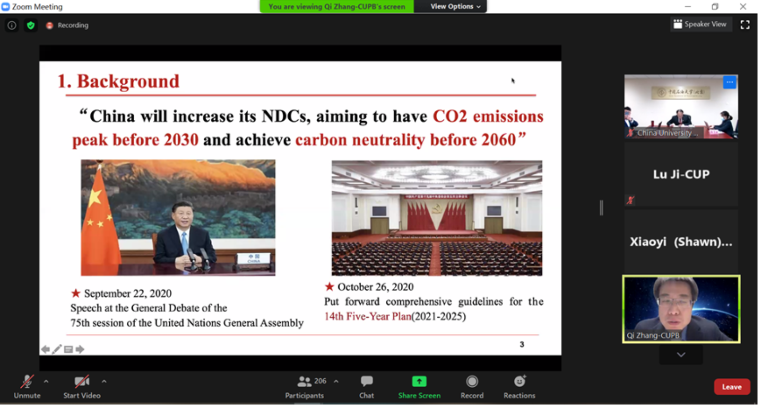 Next, Prof. Volker Roebenfrom University of Dundee , Prof. Martin Freer from University of Birmingham , Prof. Steven Griffiths, vice-president of Khalifa Universityof Science and Technology, Prof. Zhang Qi from China University of Petroleum-Beijing, Prof. Carol Dahl from Colorado School of Mines, and Prof. Evgeny Solomin from South Ural State University made keynote speeches respectively on topics of “From Paris to Glasgow: how will commitments to international climate change agreements shape the energy transition?”, “Paths to Net Zero: A Technology Perspective”, “Global Energy Transition: Challenges and opportunities for natural resource rich countries”, “Energy Revolution: How Will China Reach Net-zero?”, “How Will the Biden Presidency Change the Course of US Energy and Climate Policies?”, “Renewables may save a mankind”, “Skills and education towards energy transition”. The participantsactively discussed the opportunities and challenges brought about by the globalenergy transformation of carbon-neutral. They praised the well-organization of this meeting and the well concerned topics. They hoped to attend more seminars held by WEUN on current energy-related hot topics in future.