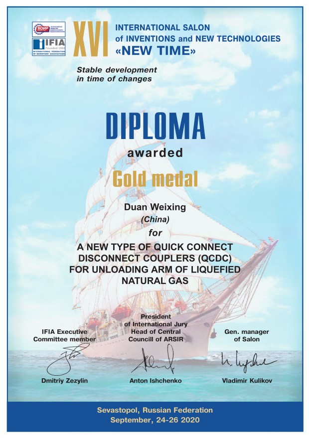 Recently, Duan Weixing, a mechanical engineering master student of grade 2019 from the College of Safety and Ocean Engineering of CUP, won the gold medal at the 16th Russian"NEW TIME" International Salon of Inventions and New Technologies with his invention project "A new type of Quick Connect Disconnect Couplers (QCDC) for unloading arm of liquefied natural gas ".