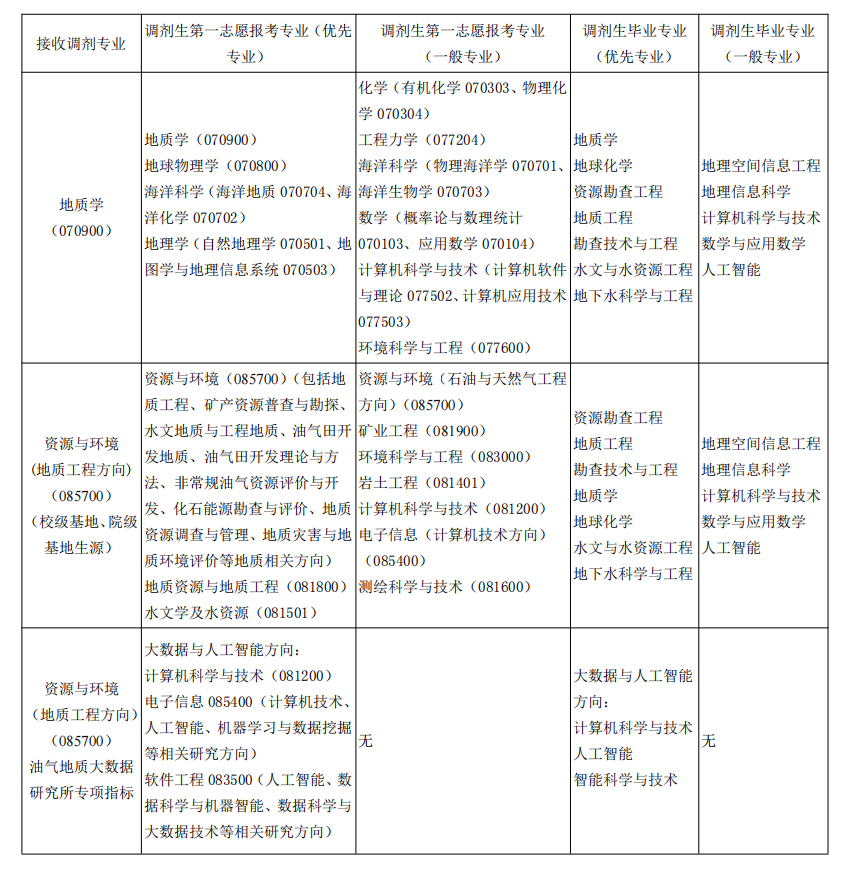接收调剂的专业包括地质学、全日制资源与环境(地质工程方向),具体缺额、接收调剂的初试考生类型、考试科目要求及初试分数线的要求见表1。