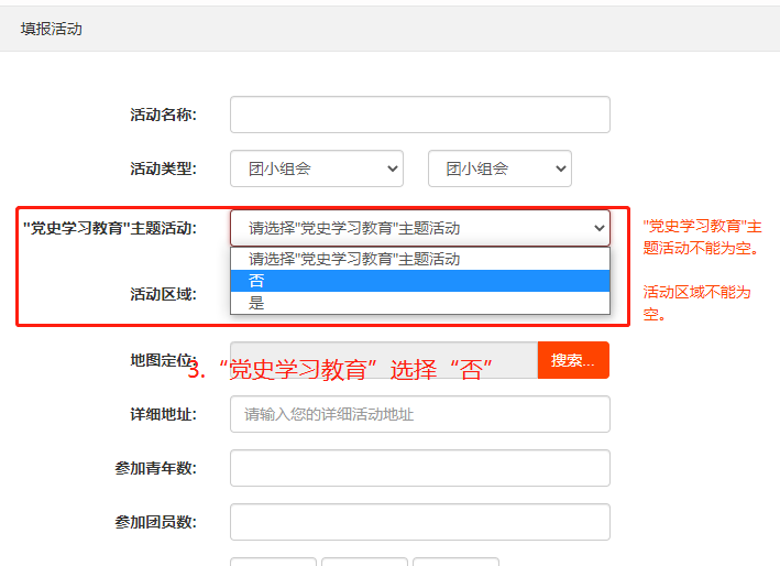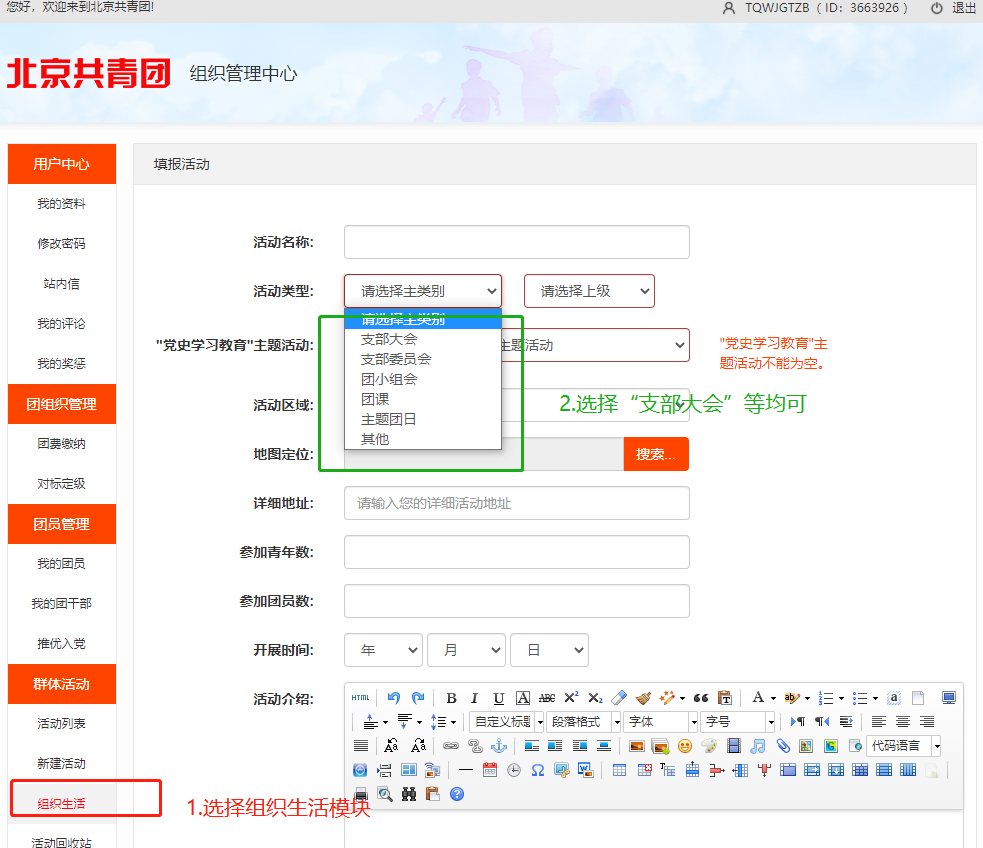 在群体活动中新增组织生活模块用于录入“青力冬奥”为主题的活动开展情况。选择组织生活--活动类型均可选择--“党史学习教育”主题活动选择否。