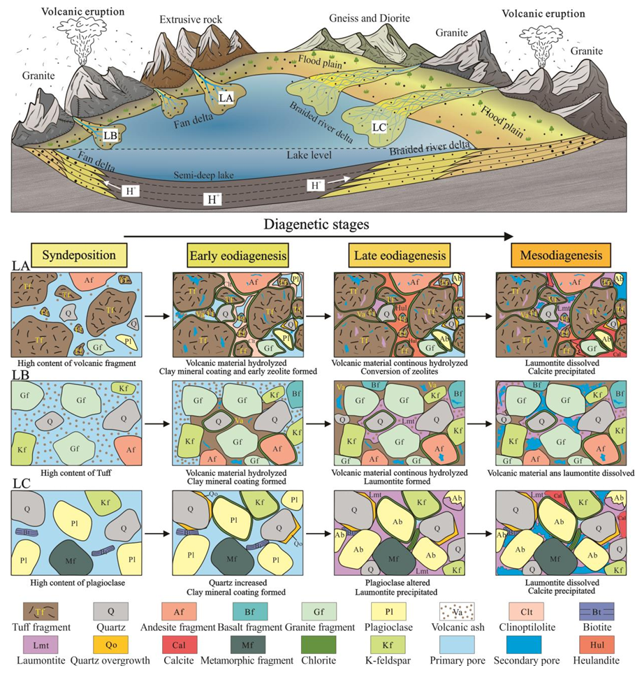 近日,我院朱世发教授研究团队在沸石类矿物—浊沸石的系统研究方面取得了重要进展。浊沸石是一种富钙沸石,常以自生矿物的形式出现于沉积岩中,由于其形成所需条件的特殊性以及在酸性环境中表现出的显著不稳定性,为分析沉积-成岩系统和寻找中-深层高品质储层提供了关键的地质线索。研究表明,浊沸石通常以连晶和斑状胶结物、裂缝充填物、交代产物的形式发育于垂向上相互叠置的三角洲水下分流河道砂体中,富含斜长石的砂岩或富含火山物质的砂砾岩是其形成的有利岩石类型。沉积岩中的浊沸石是典型的低Si/Al沸石(2.00-2.20),其化学组成不受温度和产状影响,形成方式包括斜长石的钠长石化、火山物质转化、片沸石等早期沸石转化等。流体包裹体测温数据表明沉积岩中浊沸石的形成温度主要在60-140℃之间,斜长石和火山物质向浊沸石的转化可以在较大的温度范围内持续进行,而片沸石向浊沸石的转化温度通常大于90℃。高pH、低pCO2、富Ca2+的流体条件是浊沸石生成的关键因素,Na+的存在有利于降低浊沸石生成反应的平衡温度。虽然早期形成的浊沸石占据了原生孔隙,但它也有助于抵抗压实作用,由于发育良好的解理和较大的内部空腔体积,浊沸石比其他铝硅酸盐更容易在酸性流体中溶解,浊沸石溶孔发育带更是油气聚集成藏的有利区带。该研究系统的综述了中国陆相湖盆沉积岩中浊沸石的研究进展,探讨了砂砾岩中浊沸石的成因、形成演化模式及其对油气储层的影响,为火山-沉积盆地成岩系统研究及中深层-超深层含浊沸石砂砾岩优质储层发育机理研究提供了一定的理论基础。