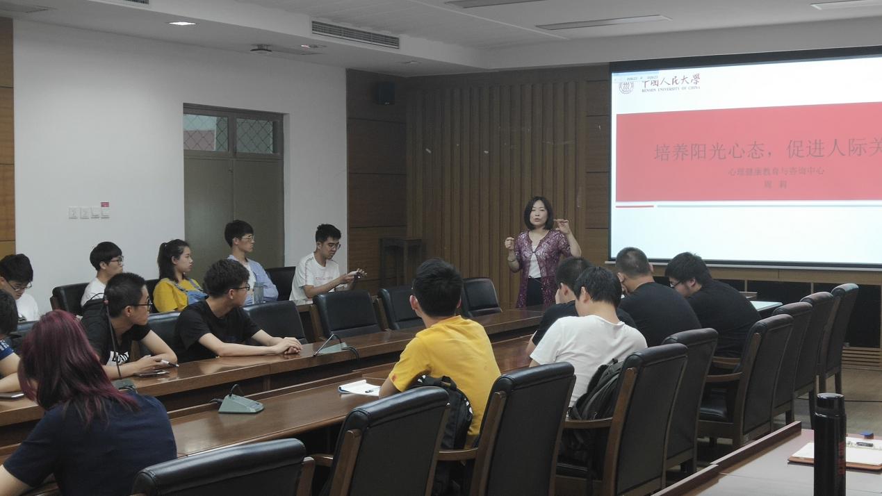 2019年6月19日,地球科学学院邀请中国人民大学心理健康教育与咨询中心副教授、北京社会心理学会理事周莉以及学院各班级心理委员在地质楼204举办“培养阳光心态,促进人际关系” 主题心理讲座。