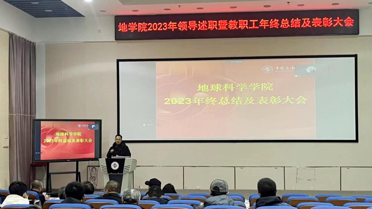 凝心聚力担使命,奋楫扬帆新征程。2023年12月28日下午,地球科学学院以线上线下相结合的方式,举行2023年学院领导述职暨教职工年终总结表彰大会。学院党委书记姜福杰、院长王贵文、党委副书记王茹、副院长牛花朋、刘钰铭以及全院教职工参加会议。大会由学院党委书记姜福杰主持。