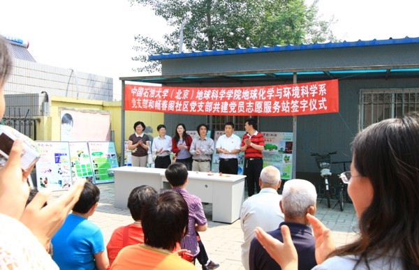 社区与高校联合共建党员志愿服务站是发挥高校资源优势、服务社区建设的一种探索,地球化学与环境科学系党支部本着发挥环境科学学科教育资源优势,服务地方环境建设需要的原则,与畅春阁社区党支部经过多次协商,达成在畅春阁社区共建党员志愿服务站的共识,并明确了党员志愿服务站的服务目标、形式与内容,即以畅春阁绿色社区建设为目标,以社区环境建设为服务对象,以双方党支部、党员为开展服务的主体,通过开展形式多样的环境宣传教育活动,使社区居民了解环境科学的基本知识和当前人类面临的环境形势,认识自己的环保权利和责任,增强环境意识,提高参与环境保护的能力,在社区形成“人人崇尚绿色生活和绿色消费,关心环境质量,积极监督环境执法,参与政策制定,从身边的小事做起,以绿色行为规范自律”的良好风气。