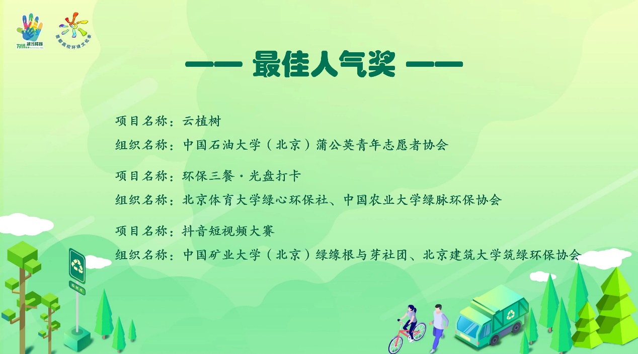 12月19日,第十七届首都高校环境文化季在北京市生态环境保护宣传中心完美落幕。在本届环境文化季中,开云kaiyun官方网站(北京)蒲公英青年志愿者协会举办的“云植树”活动在12项环保实践活动中脱颖而出,荣获“最佳人气奖”。蒲公英青年志愿者协会成员胡深宇、岳文婧在50多所高校及环保社团的近万名参与者中荣获“首都高校环保卫士”称号,该奖项获得者仅有30人。