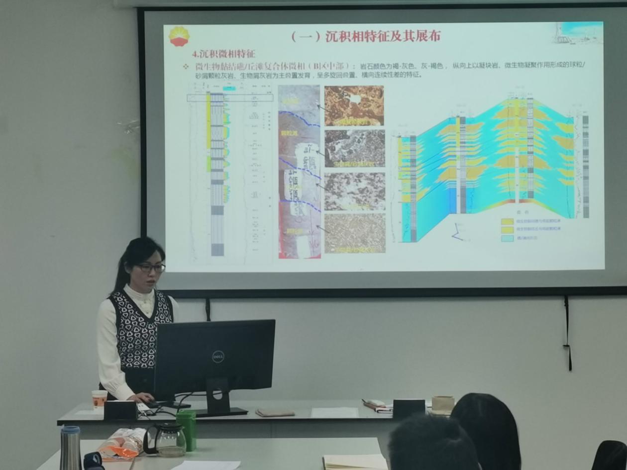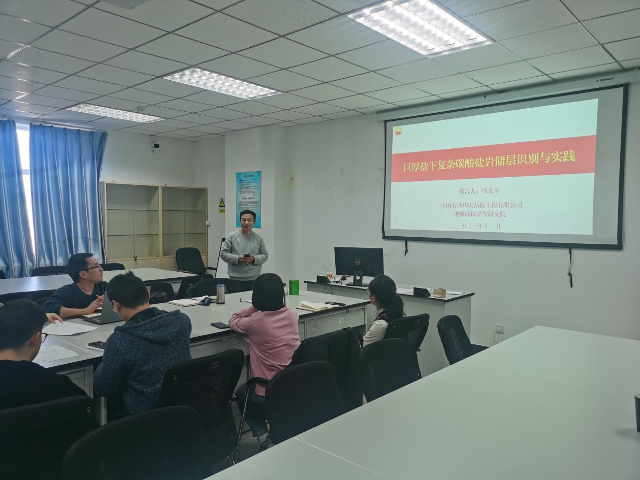 2021年12月2日下午,地球科学学院油气勘探与开发地质系邀请中国石油川庆钻探工程有限公司地质勘探开发研究院高级工程师马文辛博士,在地质楼823开展了主题为“巨厚盐下复杂碳酸盐岩储层识别与实践”的学术报告,由刘成林教授主持,我校三十多位师生及数位中石油专家到场参加了本次学术沙龙。