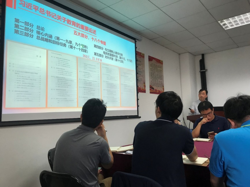 首先,盆地与油藏研究中心教工党支部书记刘小平作了题为“坚守教育报国初心,勇担立德树人使命—习近平总书记关于教育的重要论述学习体会”的报告。刘小平带领大家回顾并学习了习近平总书记关于教育的重要论述,详细解读了教育部编著的《深入学习习近平关于教育的重要论述》的主要内容。并汇报了三点学习体会:一要提高政治站位,解决“为谁培养人”的问题;二要落实立德树人根本任务,解决“培养什么人”的问题;三要提高教师的自身综合素质,解决“怎样培养人”的问题。习近平总书记指出,教师是人类灵魂的工程师,是人类文明的传承者,承载着传播知识、传播思想、传播真理,塑造灵魂、塑造生命、塑造新人的时代重任。要做到“四个相统一”,做好“四个引路人”,争做“四有”好老师。