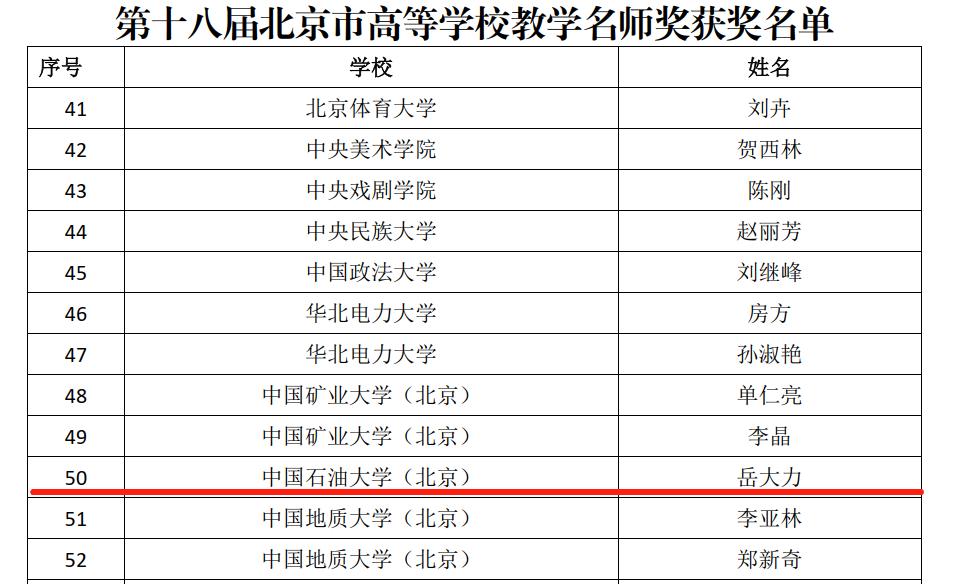2022年9月,北京市教育委员会发布《关于公布2022年度北京市高等学校教学名师奖获奖名单的通知》(京教函〔2022〕396号)。地球科学学院岳大力教授荣获第十八届北京市高等学校教学名师奖。