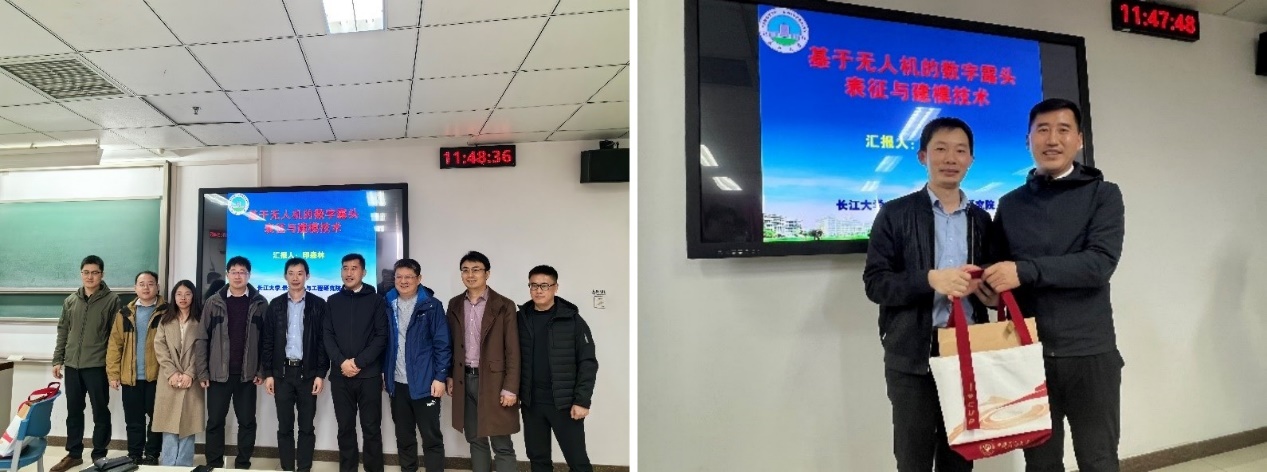 在岳大力教授的主持下,印教授与老师、同学们进行了热烈的交流讨论,针对复杂条件下的无人机扫描技巧、数据后处理方法做出了详尽回答,强调指出,无人机露头建模的核心是关键点的拼接与多角度叠加。最后,印教授作为石油大学优秀博士毕业生,岳老师为其送上了校庆70周年的纪念礼品。