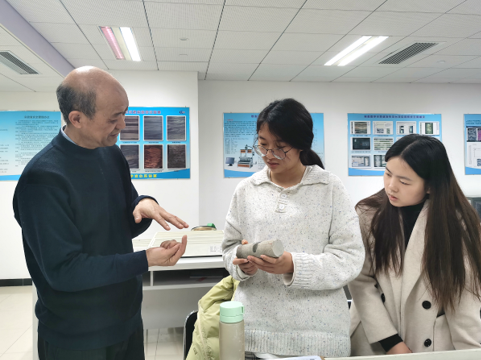 研讨会分为理论学习和实践观察两部分。在理论学习开始之前,朱筱敏教授由“一花一世界、一心一沉积”这样一句蕴含哲理的话语引入主题,引发了在场学生的思考和共鸣。随后,朱教授从观察岩心的基本方法作为切入点,结合沉积学基础知识,从岩性、结构、沉积构造、沉积序列等方面,详细讲解了如何观察岩心、如何确定岩性和沉积构造、如何恢复沉积古环境等内容。岩心记录着地球的过去,是研究沉积环境和沉积类型的第一手宝贵资料。理论学习上,朱筱敏教授通过展示大量岩心实物典型照片,逐一讲解了各类岩心相标志,引导在场学生养成严谨细致的科研态度;通过多次研讨,实现了与在场学生的互动交流,促进了大家的深入思考。理论学习结束后,师生们来到了实物岩心实验室,开展岩心观察的实践环节。四位导师分为四组,对同学们在实践中产生的疑惑进行了耐心解答,并结合理论知识,身体力行指导大家观察实物岩心和判定沉积环境。在场本科生和硕博研究生都表现出对岩心的极大兴趣,大家仔细观察、积极思考、主动提问,师生联动的科研氛围十分融洽。