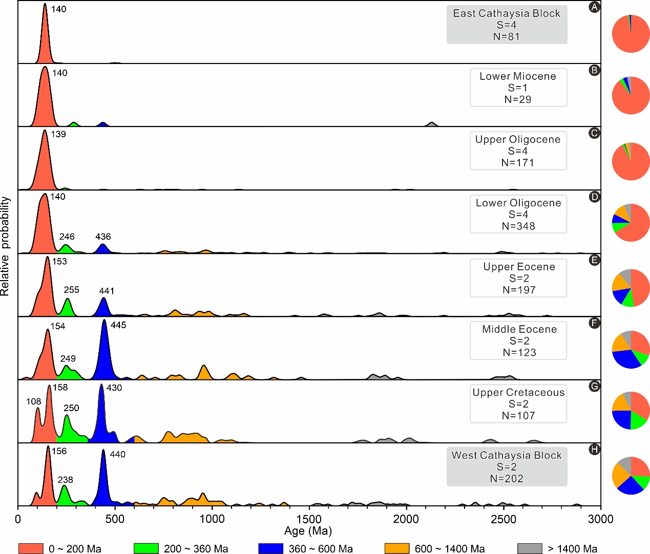 珠江口盆地东部陆丰凹陷上白垩统-下中新统及其潜在盆外物源区(灰色阴影标注)锆石U-Pb年龄谱图。