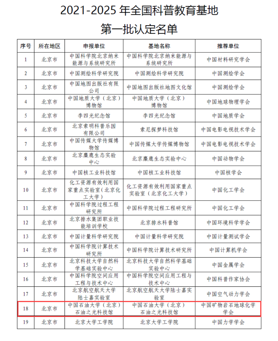 2022年2月7日,中国科协办公厅公布了“2021-2025年‘全国科普教育基地’第一批认定名单”,我校石油之光科技馆(含地球科学博物馆)位列榜单第18位,正式入选“2021-2025年第一批全国科普教育基地”。