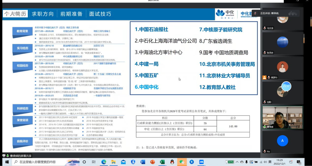 曹瑛倬,男,地球科学学院2020届地质工程专业硕士研究生,现就职于中化石油销售有限公司人力资源部;分享主题:就业经验分享(企业、公务员、高校辅导员、事业编)。曹校友,首先为大家分享了他研究生毕业求职时个人简历的制作,并由此为大家讲解如何制作一份合格的求职简历,第一要选择适合自己的建立模板,第二简历内容要精简,突出重点,适当隐藏短板,第三对待不同招聘单位,简历要进行针对性的调整,这些简历制作技巧使同学们在简历制作方面有了很大的进步。其次曹校友为同学们讲解了如何确定自己的求职方向,第一要明确自己的未来工作地点,第二要选择适合自己的单位性质(国企,私企,事业单位),第三要看薪资待遇情况以及工作相关的福利条件,第四要重视工作的发展空间,根据这四点同学们在接下来的求职中方向和目标更加的明确。接着,曹校友讲解了找工作的一些前期准备,第一要补齐自身短板,提升个人能力;第二要广撒网,不同性质的工作都投递一些简历多多尝试;第三要有耐心,求职是持久战要有充分的心理准备;第四要有决心,要为最后的面试做好充足的准备。