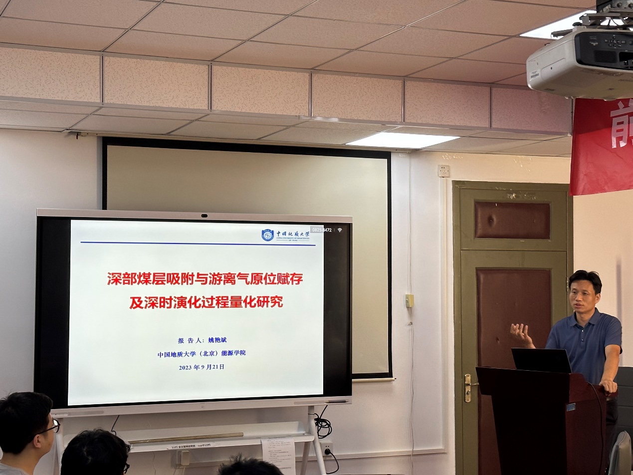 姚艳斌教授开展了题为“深部煤层吸附与游离气原位赋存及深时演化过程量化研究”的学术报告,以常规煤储层原位含气量及吸附/游离气占比相关测试方法的缺点和弊端为出发点,提出了一套基于NMR的多态甲烷定量方法,分别定量识别了煤及页岩中吸附态、孔束缚态、游离态甲烷的含量及占比,在此基础上解决了如何确定吸附相密度精度这一难题,并建立了一种原位煤储层含气量预测模型,结合实际地质模拟参数,对多相态甲烷含量深-时演化过程进行了系统的研究,为煤层气的资源量估算提供地质依据。姚艳斌教授的报告内容巧妙地将实验模拟与地质背景结合起来,具有很强的启发性。