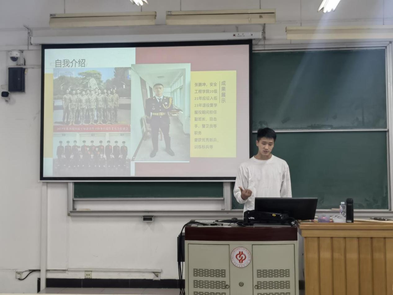 曾服役于北部战区陆军参谋部直属工作处的优秀退伍学生代表张鹏坤为同学们介绍了自己入伍两年以及复学后的收获和感想,分享了自己的军旅故事,让同学们得以切身体会军旅生活的魅力。最后,他向同学们发出呼吁,作为新时代的有志青年,理应将参军报国当作磨砺人生、实现理想的重要途径,要勇于接受祖国的召唤和挑选,积极投身国家国防事业,努力为国家的强大、人民的幸福和社会的稳定而奋斗,在军营中绽放绚丽青春,为实现中国伟大的强国梦、强军梦贡献力量。