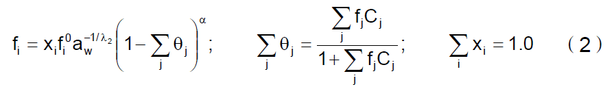其中fi、aw、θj分别为气体组分i的逸度、水活度、被气体组分j占据的连接孔的分率;xi为由气体组分i形成的基础水合物在混合基础水合物中所占的摩尔分率;fi0为纯基础水合物组分i的逸度;α和λ2为水合物结构参数。