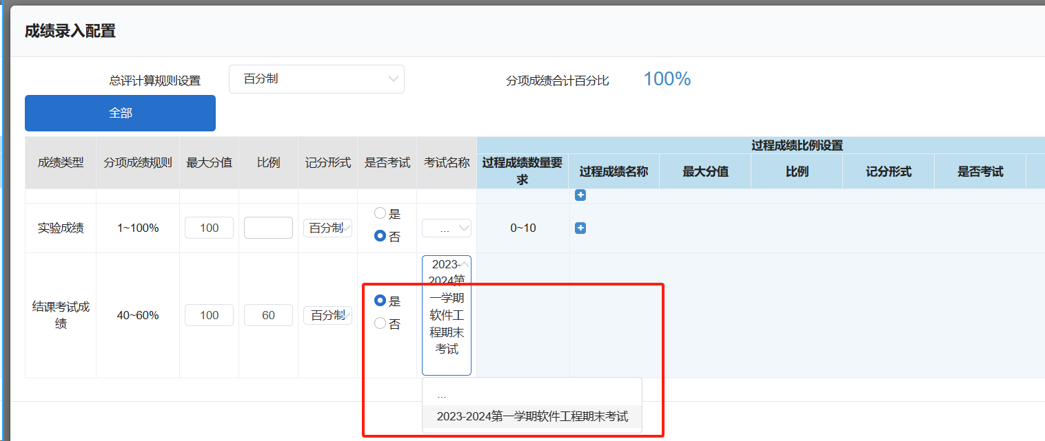 若教师录入成绩时,按照实际成绩进行录入而非满分100录入,则在录入各类过程成绩时,最大分值应填写实际最大分值,比例填写此类成绩在总成绩中的占比,占比之和仍需要等于过程成绩总占比。