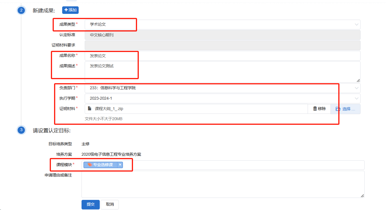 2. 进入申请页面,选择成果类型,填写成果名称、成果描述,上传《创新创业实践溢出学分用于替代专业选修课学分汇总》,最后在认定目标里选择需要认定的培养方案中的专业选修课程模块点击“提交”即可。