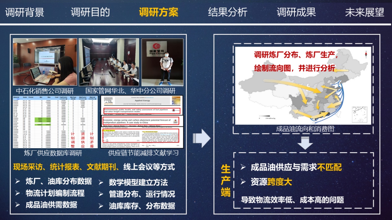 团队在经过前期充分调研的基础上,总结我国成品油供应链面临问题,以中石油、中石化供应链系统为原型,围绕生产、储存和运输三大环节,开展了炼油产能调整、油库库容整合优化研究,并对国家管网独立运营后的价格策略进行深入分析,最终形成了一种成品油供应链多环节优化技术,量化供应链优化方案,从智慧化、部门协调和行业协调方面提出政策建议,促进我国成品油供应链持续健康发展。目前,研究成果已在国家管网华北、华南、华中三个大区开展试点化应用并产生实际经济效益。