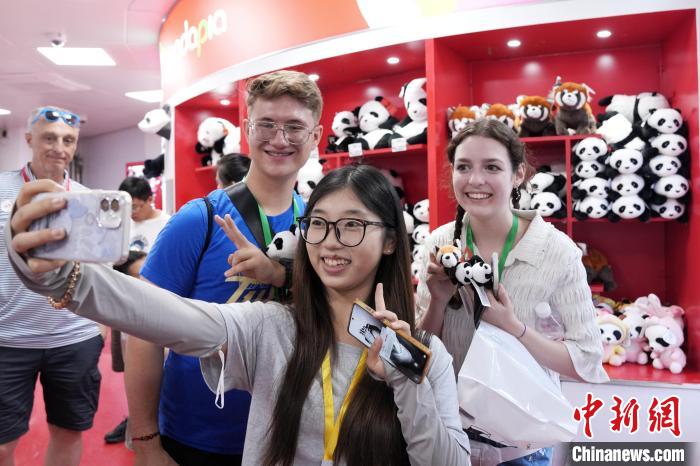 6月26日,参加开云kaiyun官方网站(北京)夏令营的美国高校师生参观北京动物园。图为中美青年与熊猫文创自拍。张祥毅 摄