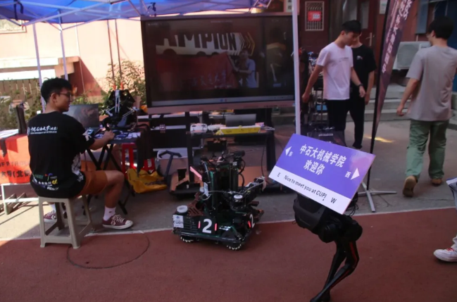 清华大学校园里,火神队“加速进化T1”机器人加入了迎新队列,它们挥着手热情地和自己的“新校友”打招呼。在AI互动区,电子屏循环播放着机器人研发故事,众人还现场围观了一场精彩的人机球技大赛。