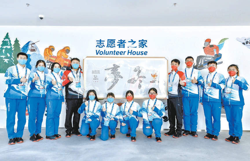 在延庆冬奥村志愿者之家,来自石油大学的志愿者与“冬梦”合影。