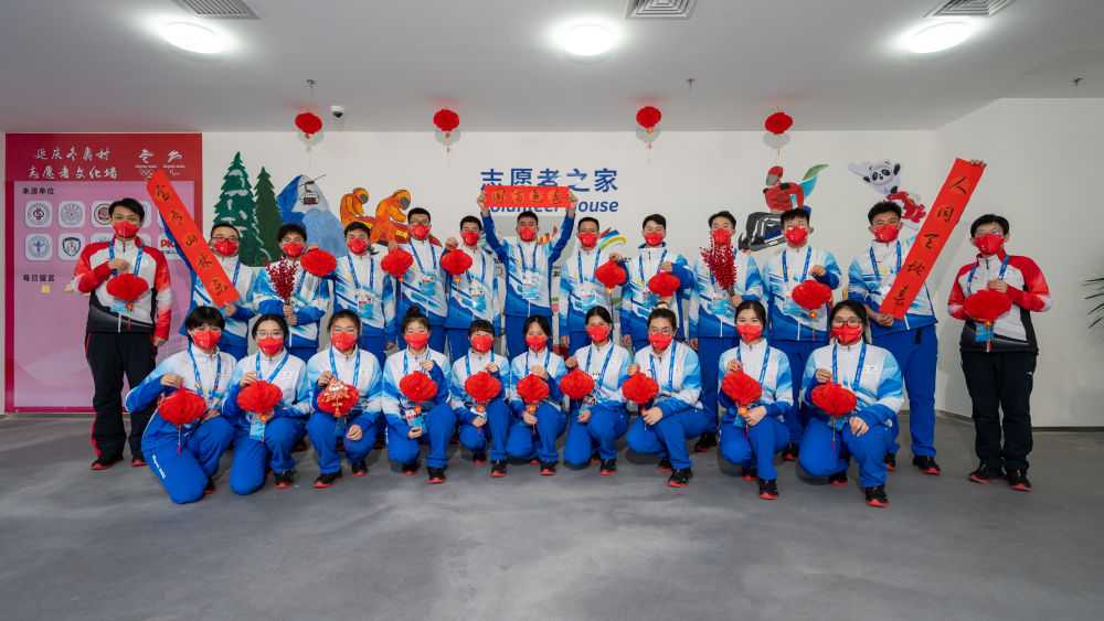 中除夕当天,北京冬奥会延庆赛区冬奥村里张灯结彩,志愿者和各代表团成员相聚一堂,庆祝欢乐祥和的春节。