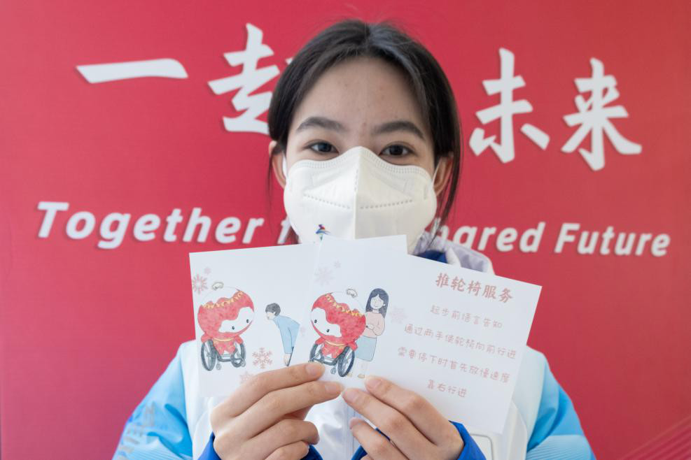 “能够给予残障人士便捷而有温度的服务就是我工作最大的意义!”李华洁说,“不久前,国际残疾人奥林匹克委员会(IPC )无障碍专家来到小庄户村遗址视察的时候,连连称赞我们的无障碍坡道设计得精巧方便。每位村民都可以在观景台上观赏中国古村落遗址,能无差别地感受中华传统文化的魅力,这也正是我们的初心所在。在工作之余,我还按《北京2022年冬奥会和冬残奥会残疾人服务知识手册》中学到的知识手绘了助残志愿服务知识卡片,提醒志愿者们正确的服务礼仪与服务技巧,我希望每位志愿者都能在需要的时候给予运动员们最恰当、最温馨的服务,以标准化的服务和炙热的内心让这个冬天更温暖!”